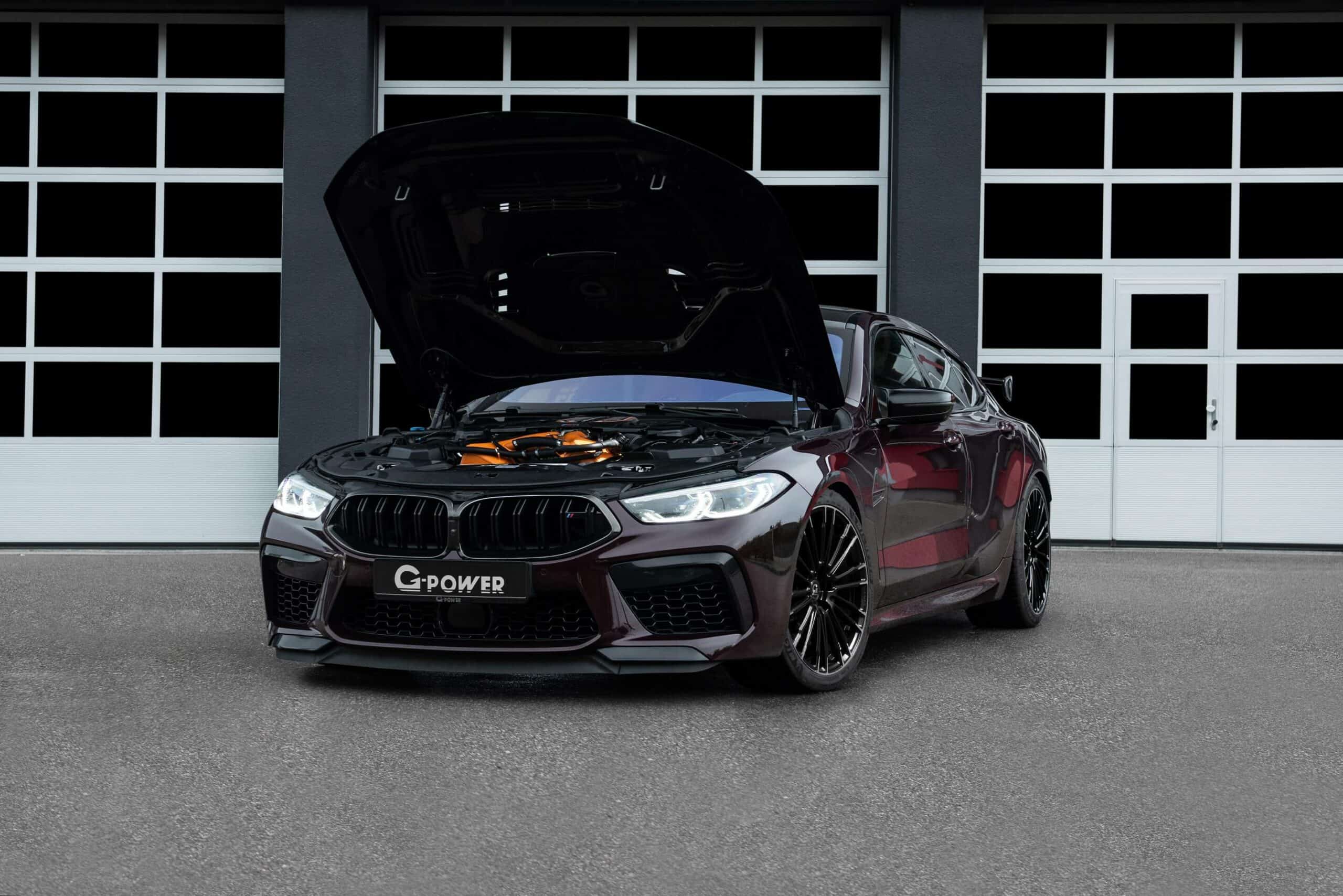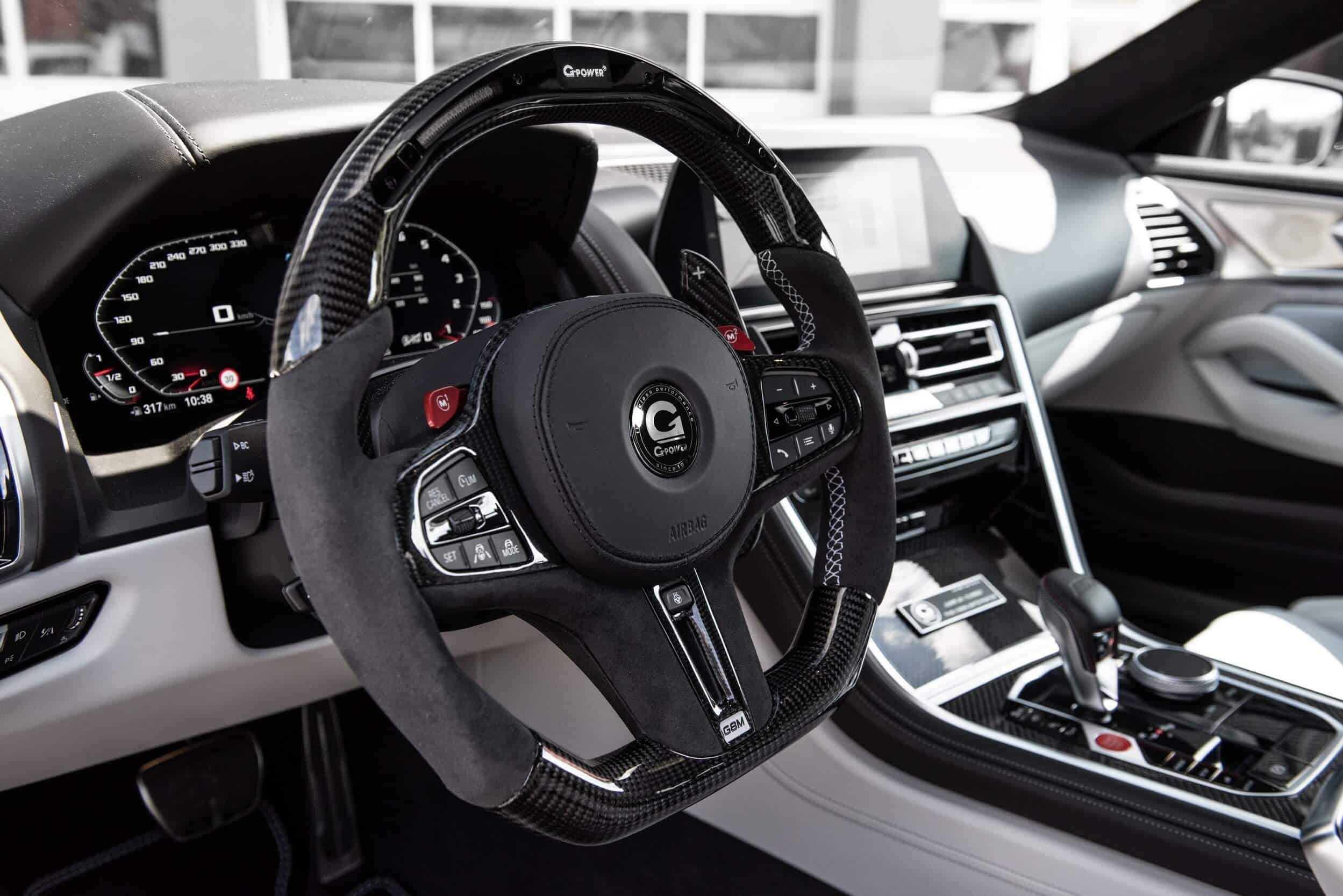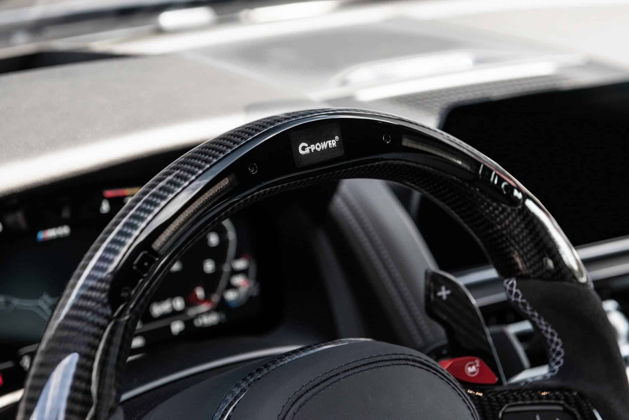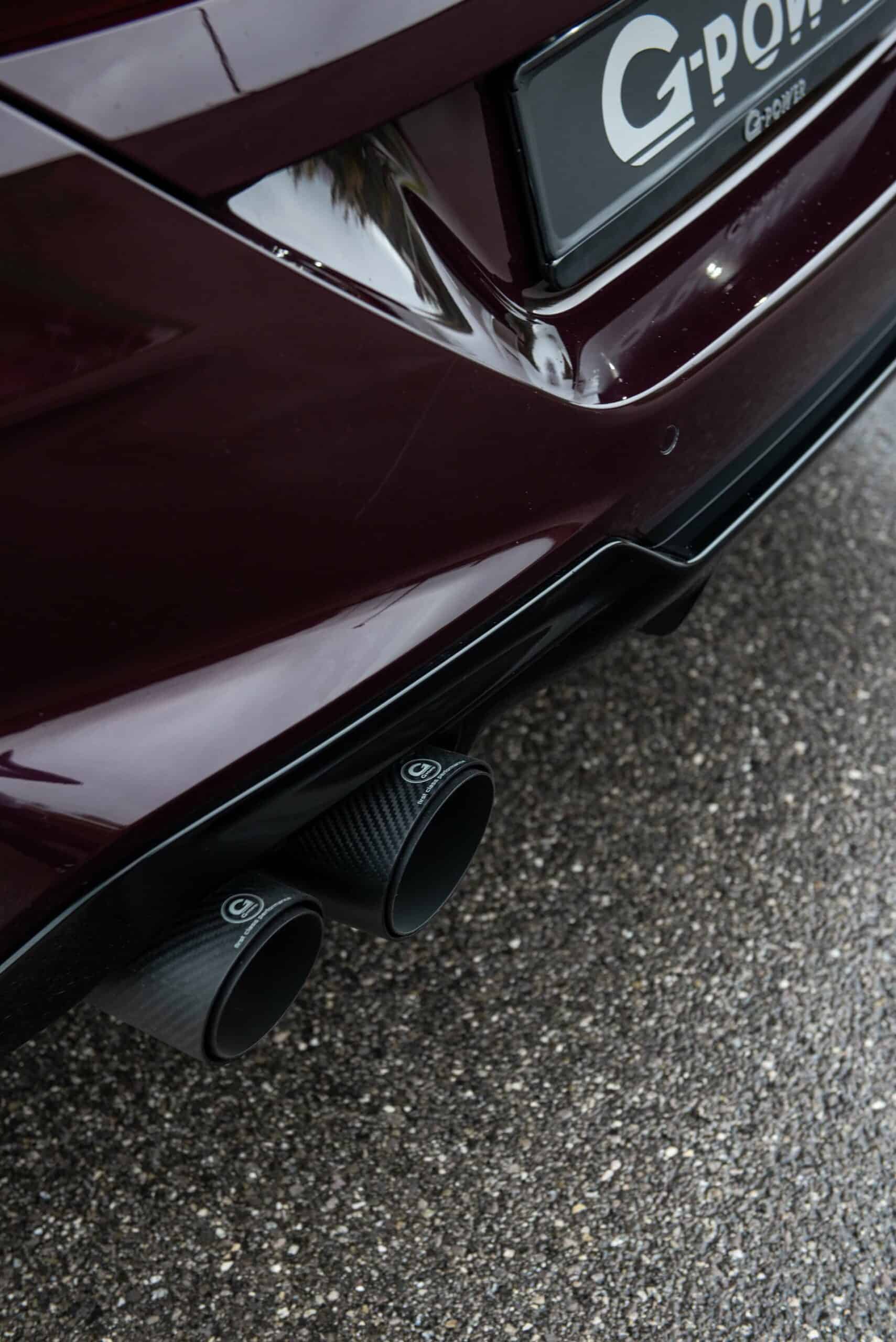To extract roughly 280 hp from the eight-cylinder engine, G-Power installed forged pistons and connecting rods along with two charge air coolers. The original turbochargers now have bigger housings and CNC-milled compressors and turbine wheels. In addition, an aftermarket exhaust with large quad carbon tips has been fitted to the tuner’s ultimate four-door M8.