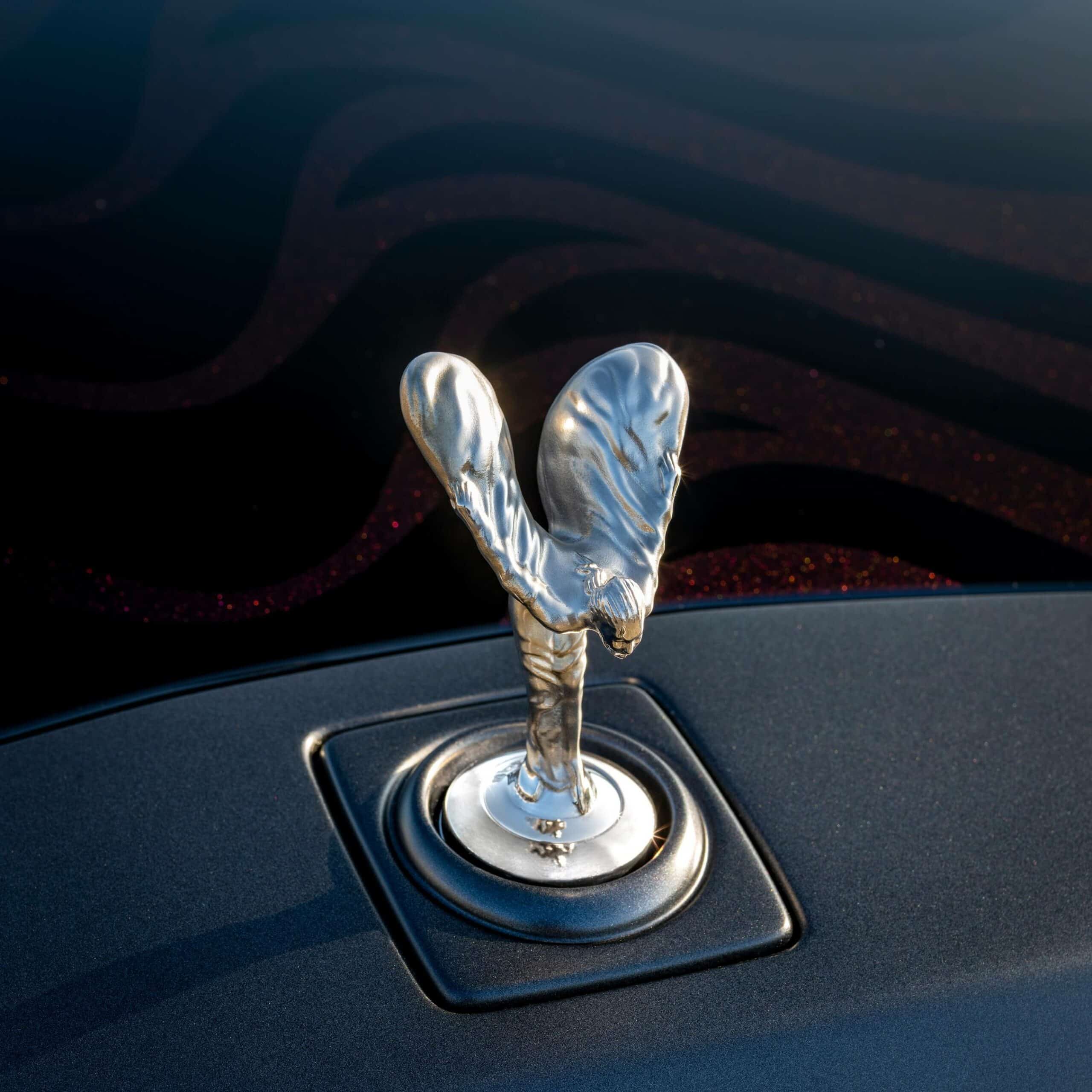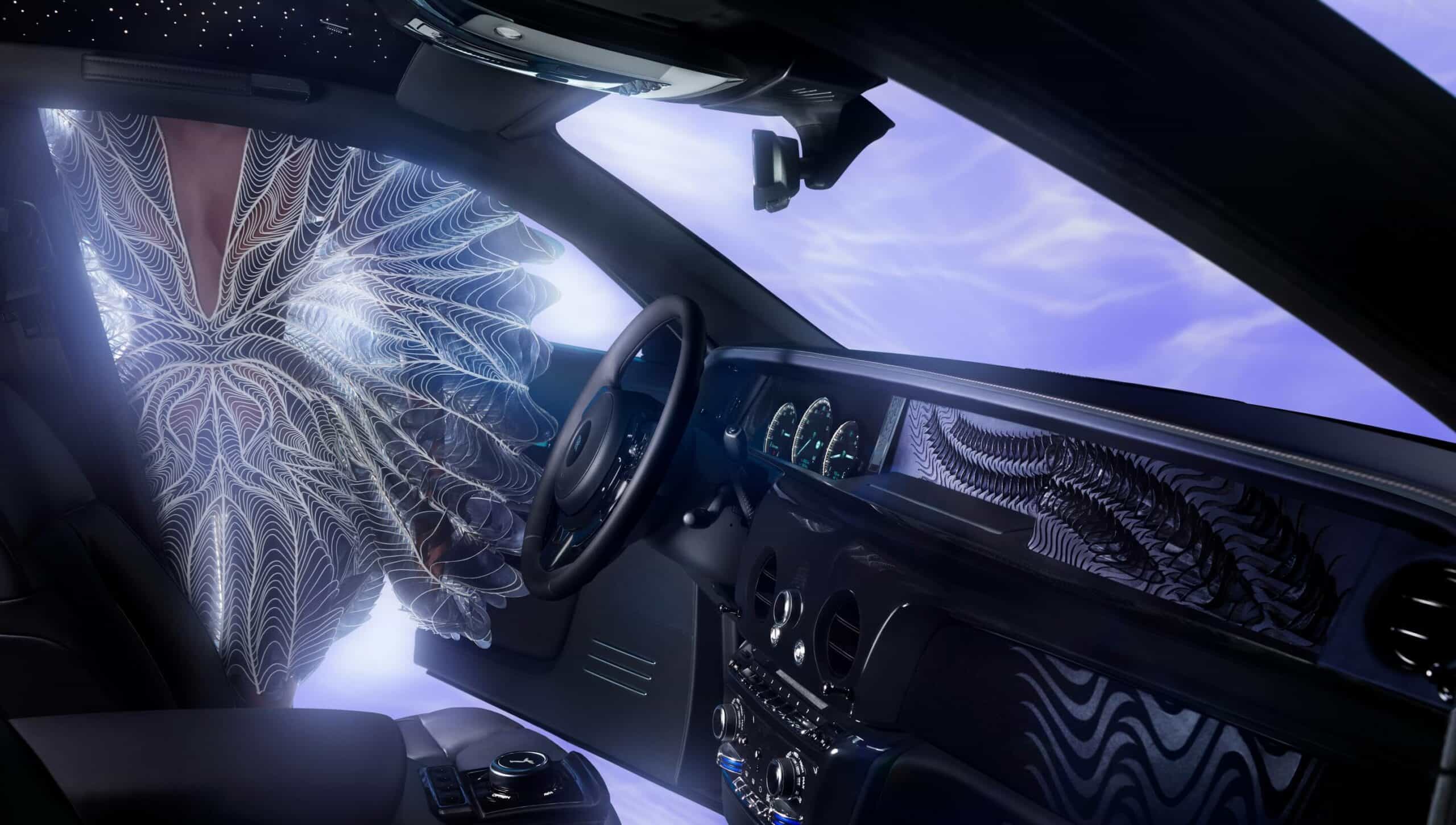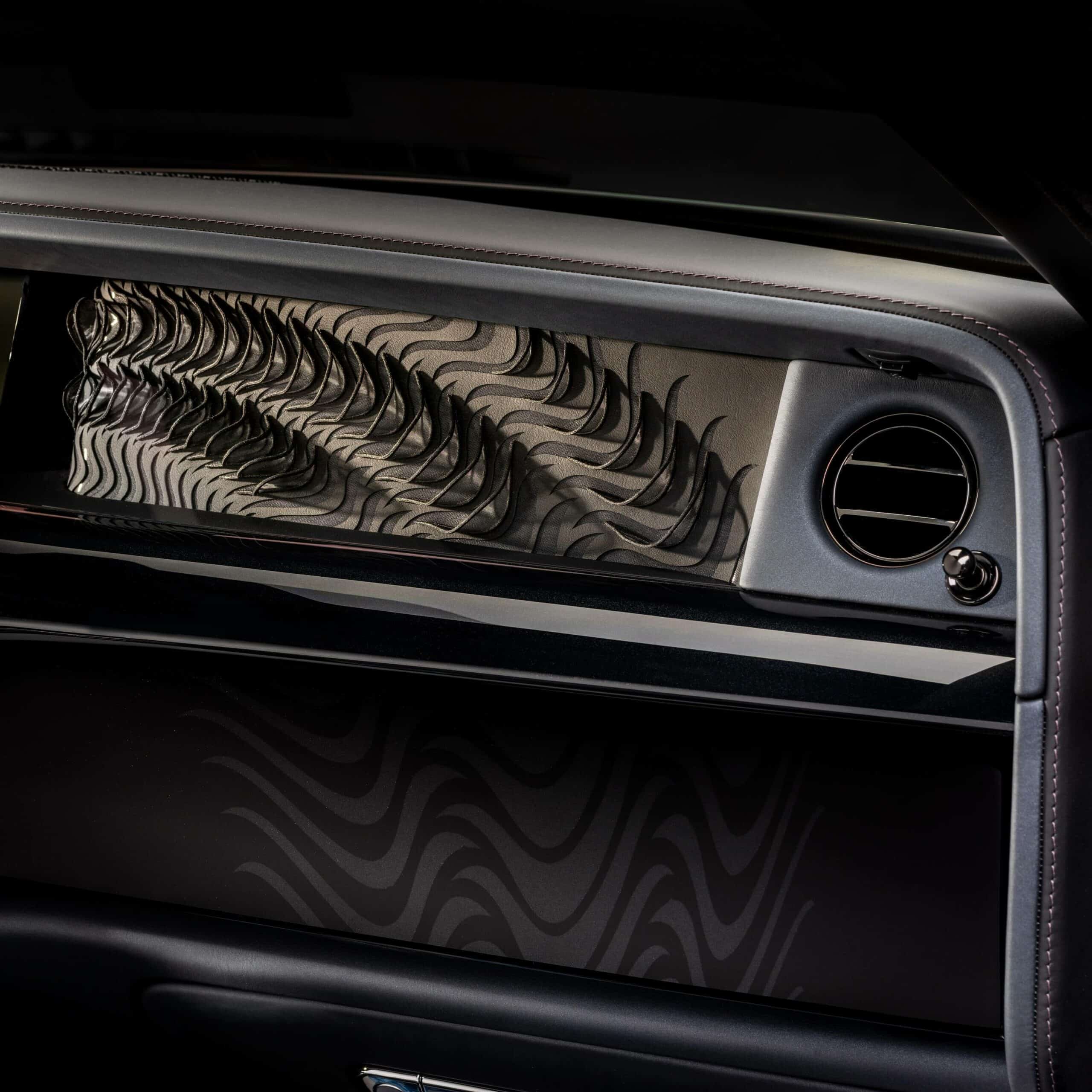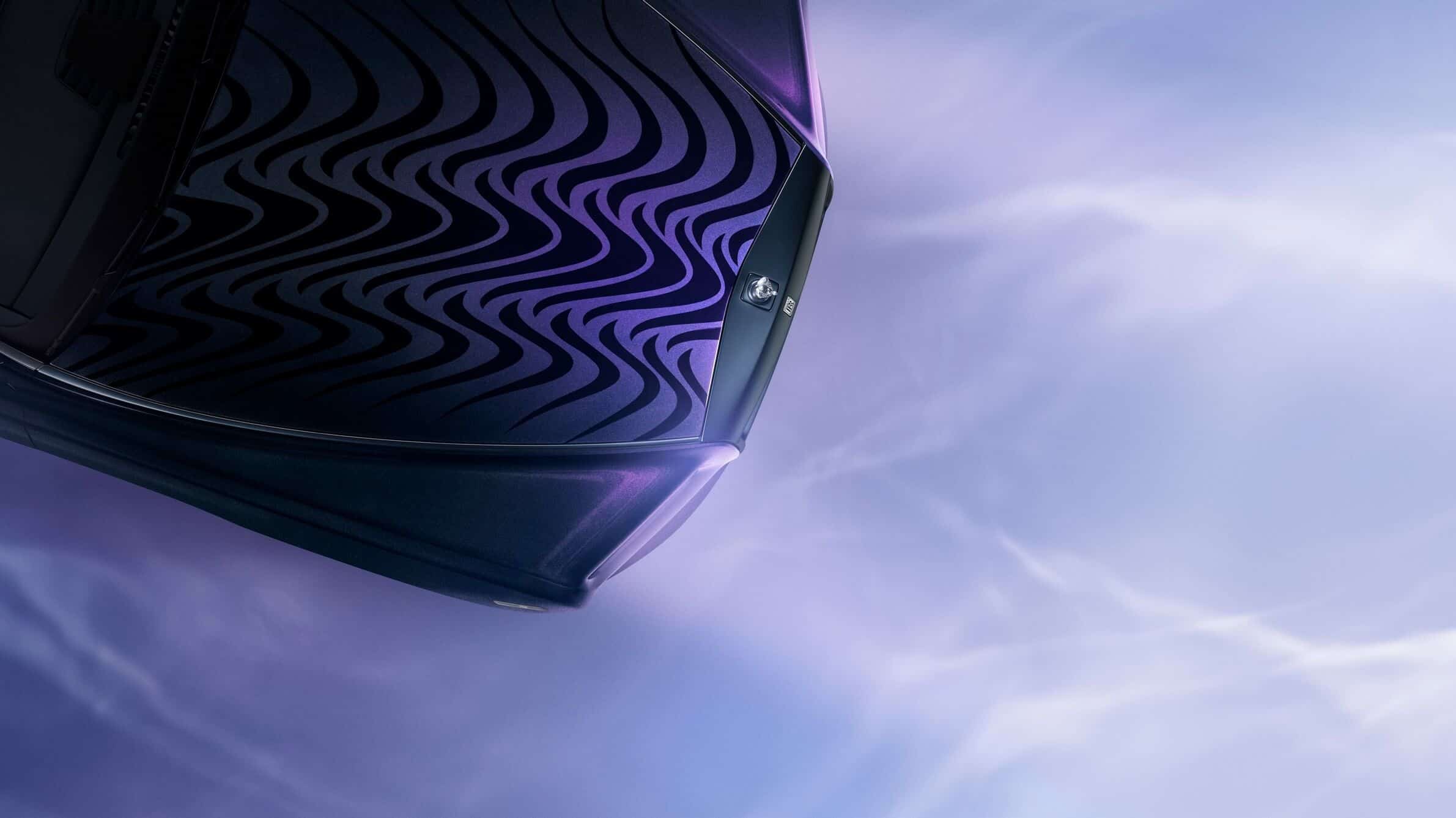 The Phantom Syntopia comes painted in an exclusive Liquid Noir color with purple, blue, magenta, and gold accents depending on the viewing angle. Applying a pigment to the clearcoat to achieve the subtle shimmer took months of development, with more than 3,000 hours spent just for testing and validation. The imposing bonnet hosts a Weaving Water motif found throughout the interior.