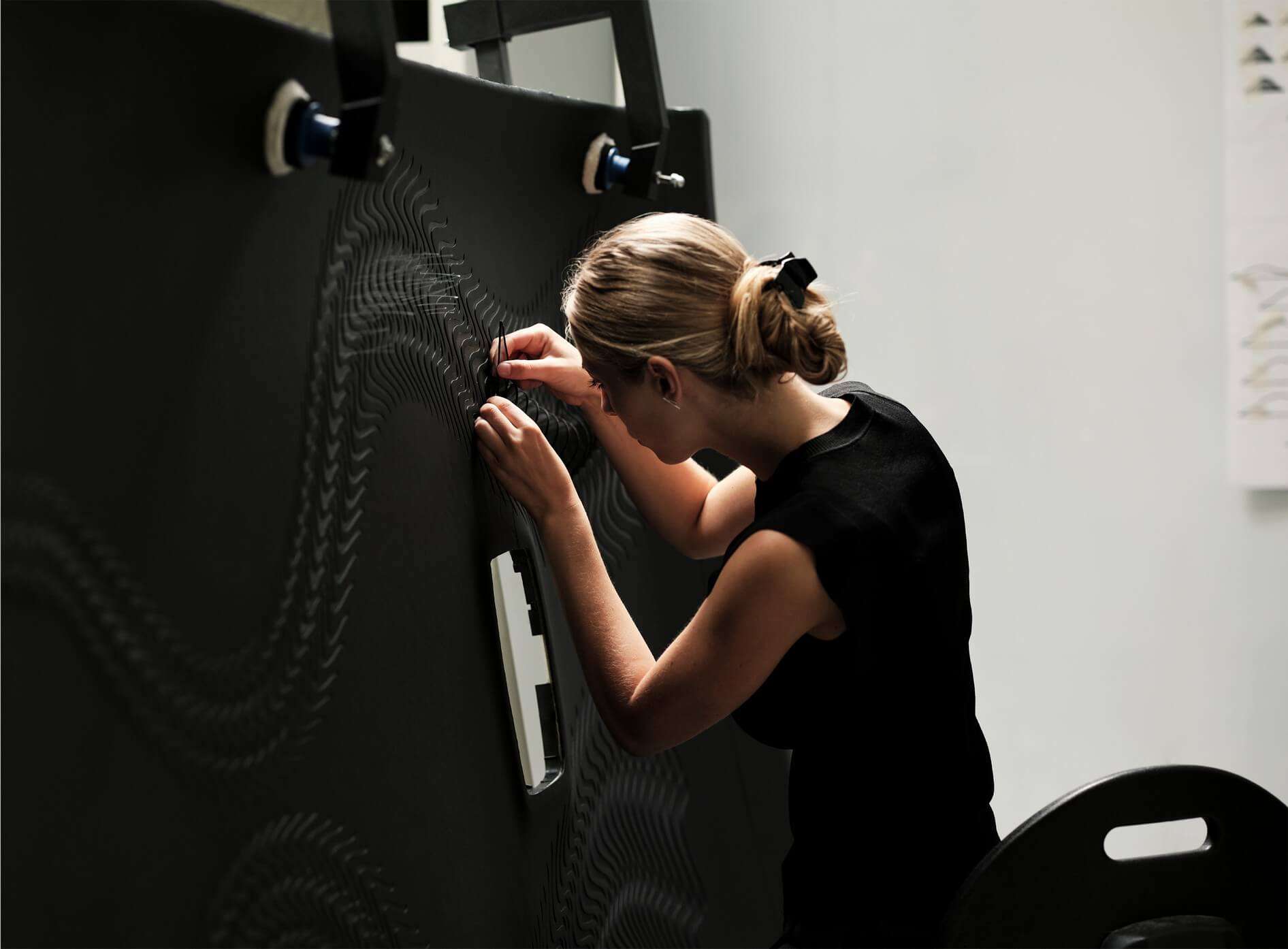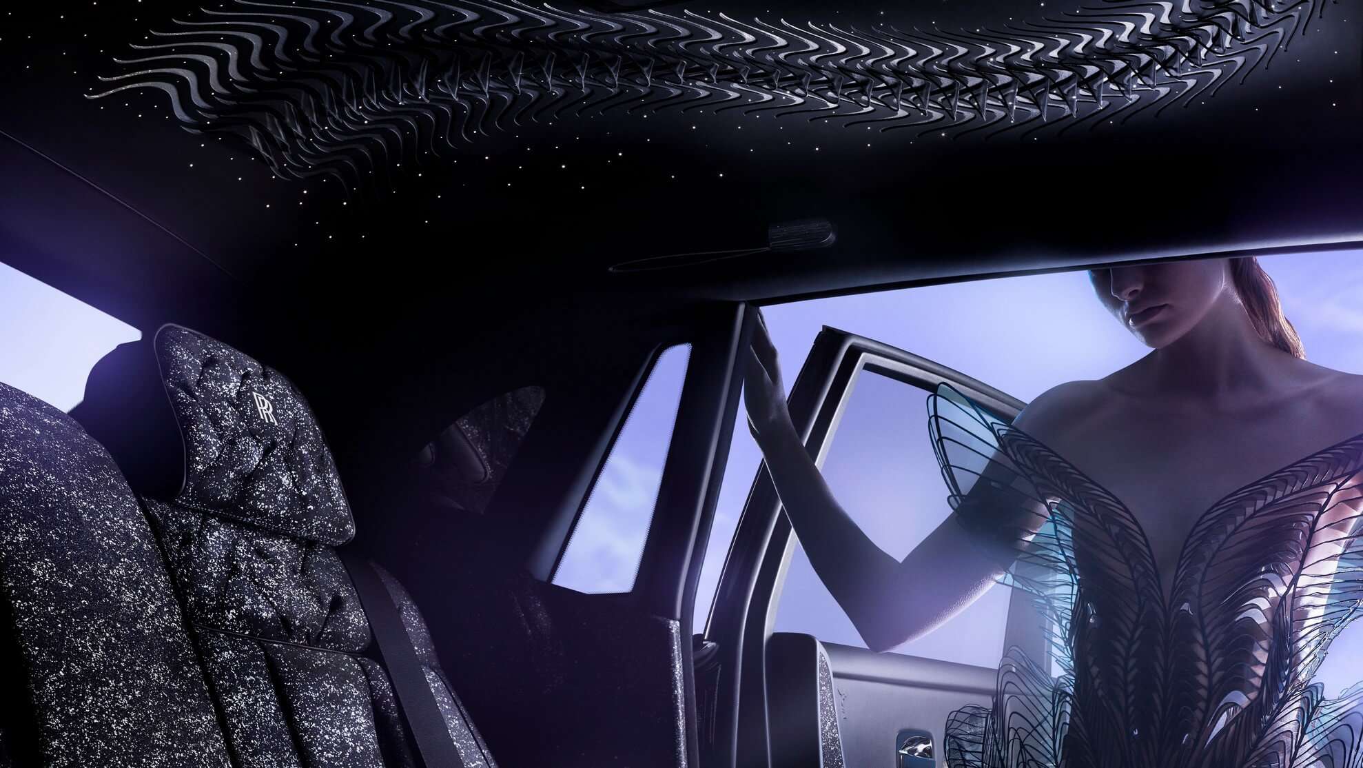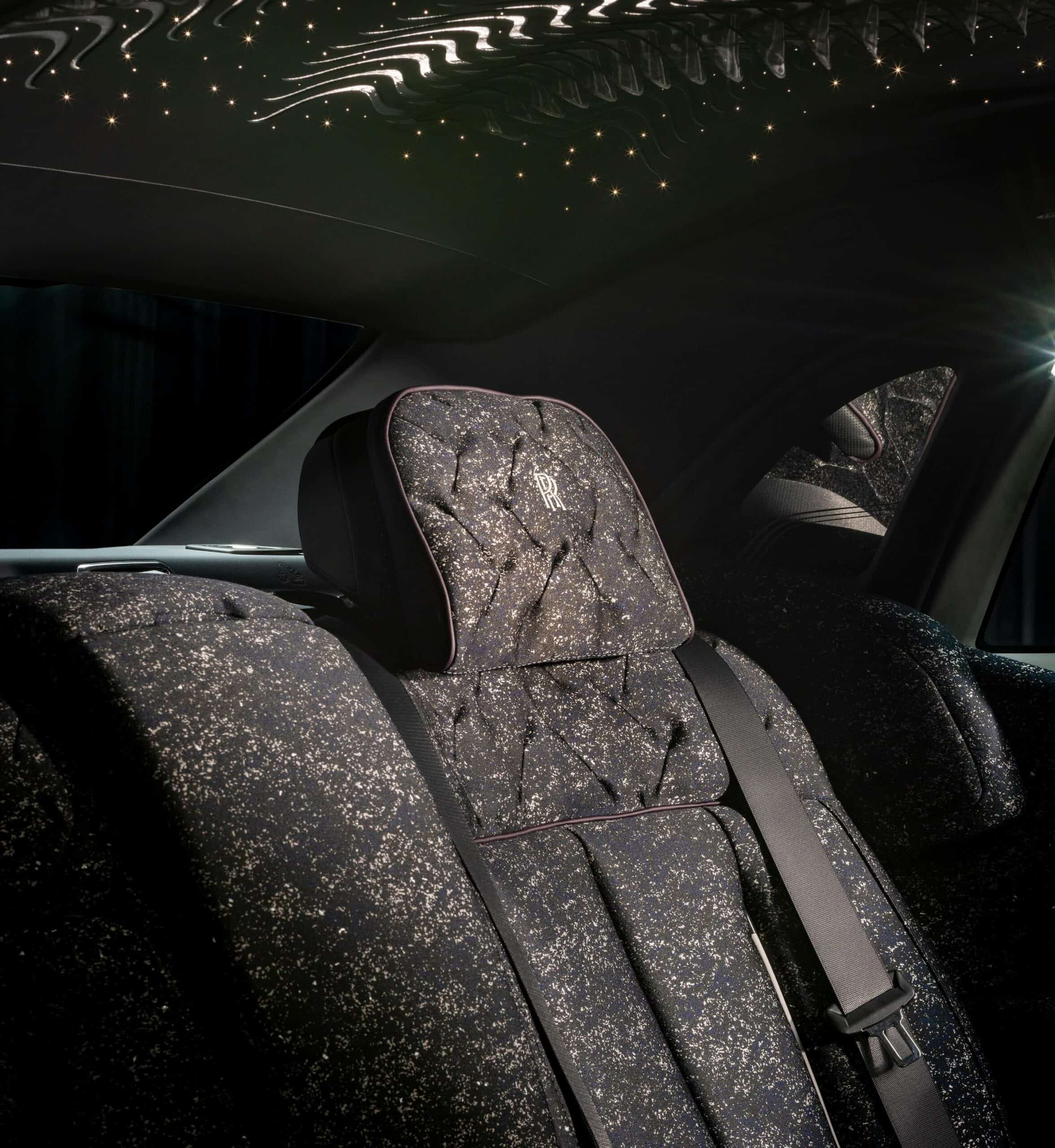 Open the coach doors and you’ll be immediately greeted by the most sophisticated headliner ever installed by Rolls-Royce. It’s covered in a single sheet of perfect leather chosen from more than 1,000 hides. Symmetrical cuts were made to show off a so-called “liquid metal” texture formed by the woven nylon fabric underneath and finished with 162 petals made from glass organza. These were applied during an elaborate process that took almost 300 hours.