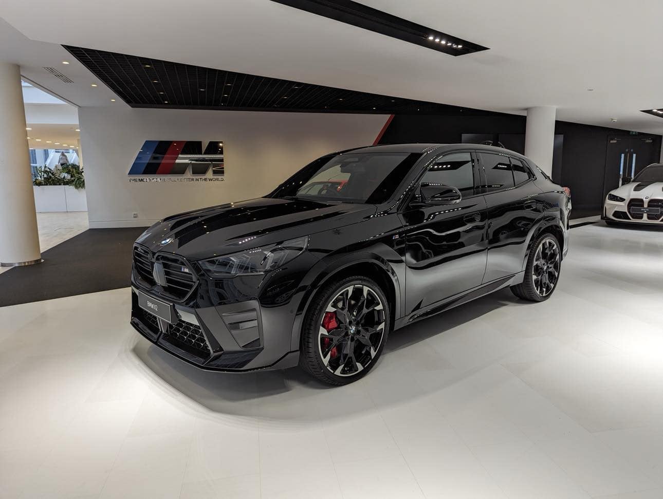Photographed at a dealership in the United Kingdom, the range-topping version of the new BMW X2 is painted in Sapphire Black and has the darkened Shadowline headlights. Substantially larger than the old model, the new coupe-SUV can be fitted with 21-inch wheels, including this two-tone set contrasted by brake calipers in red as the only splash of color.